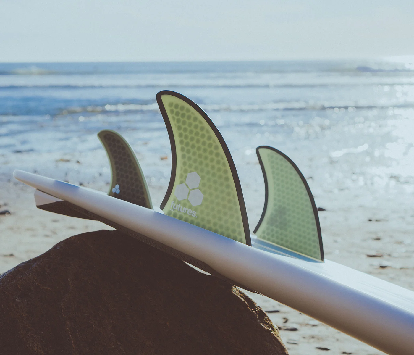 The Al Merrick Twin +1 (AMT) generates maximum speed, drive and hold through big carves to perform around pointbreaks or lined up beach breaks. The AMT's honeycomb construction gives this fin a medium flex pattern, while the large area provides ample hold in overhead surf. The set is equipped with the option to ride with a small trailer fin for increased drive and stability, creating more of a thruster feel.