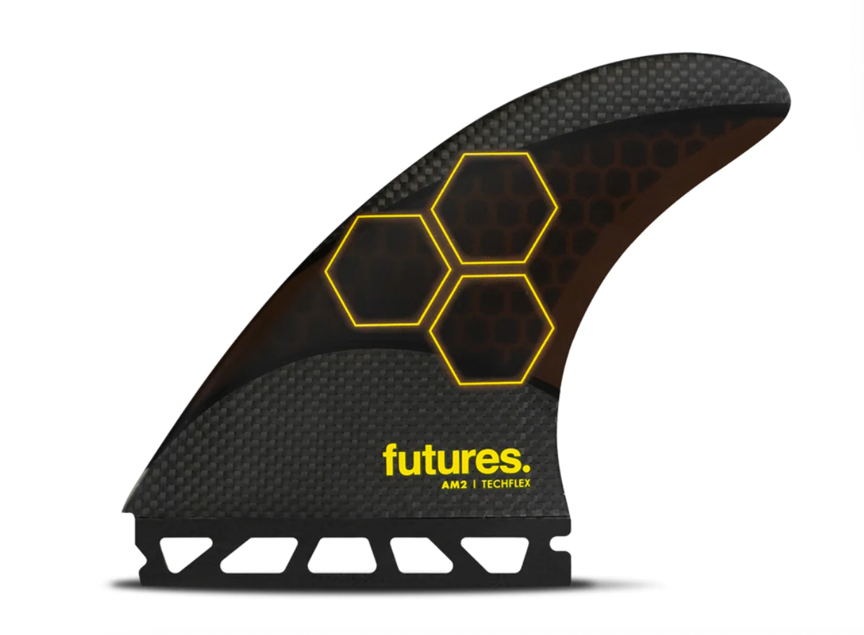 The AM2 Techflex, designed by legendary shaper Al Merrick of Channel Island Surfboards, is a large sized 5-fin setup in the Rake template category. This template features a wide base and refined tip, for the perfect combination of release and drive. The quad rear template is modeled after the rear of the Bobby Quad which is an upright fin with a fuller beak tip allowing for more maneuverability without sacrificing drive through turns.